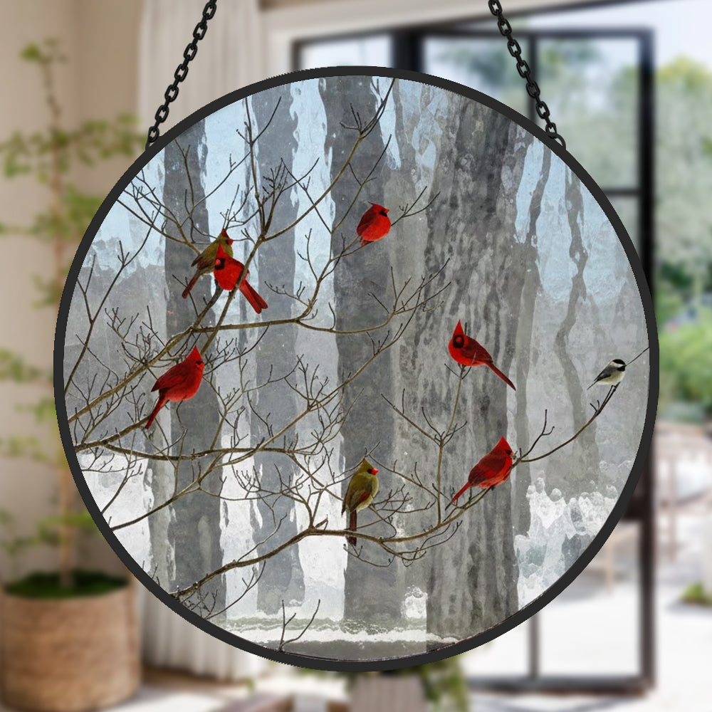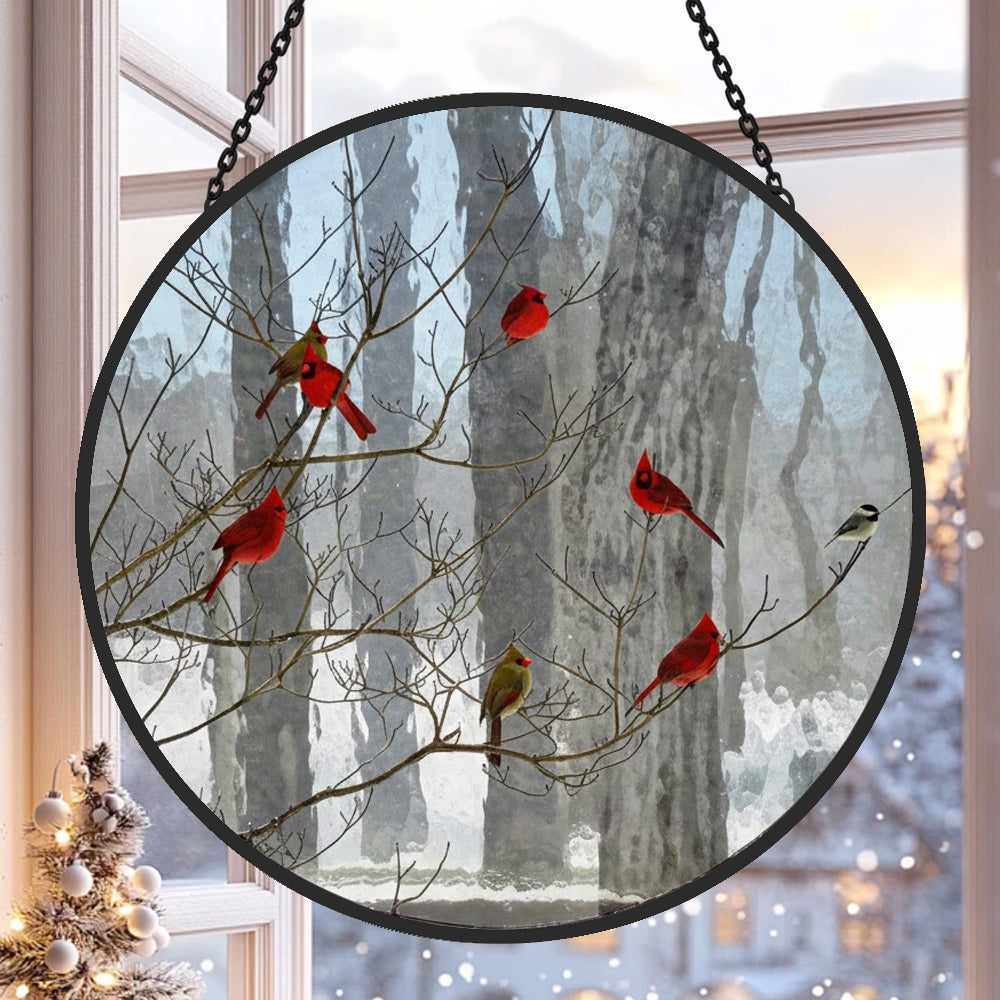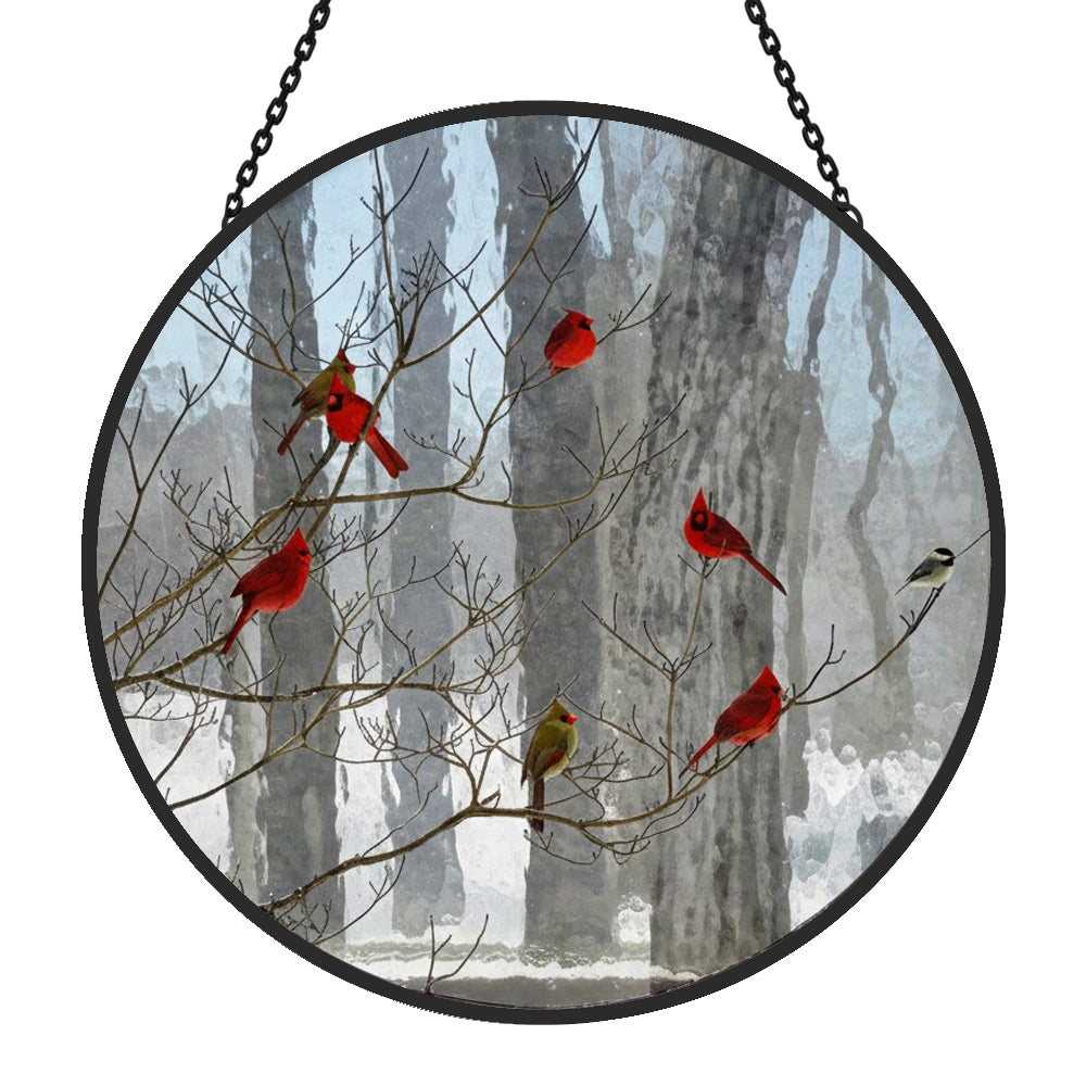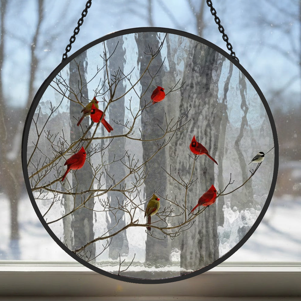 Cardinal Birds Snowy Forest Sun Catcher Stained Glass Window Hanging Decoration