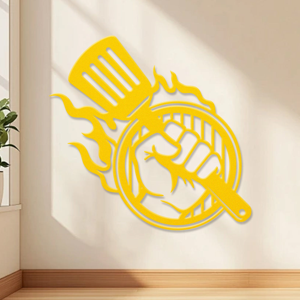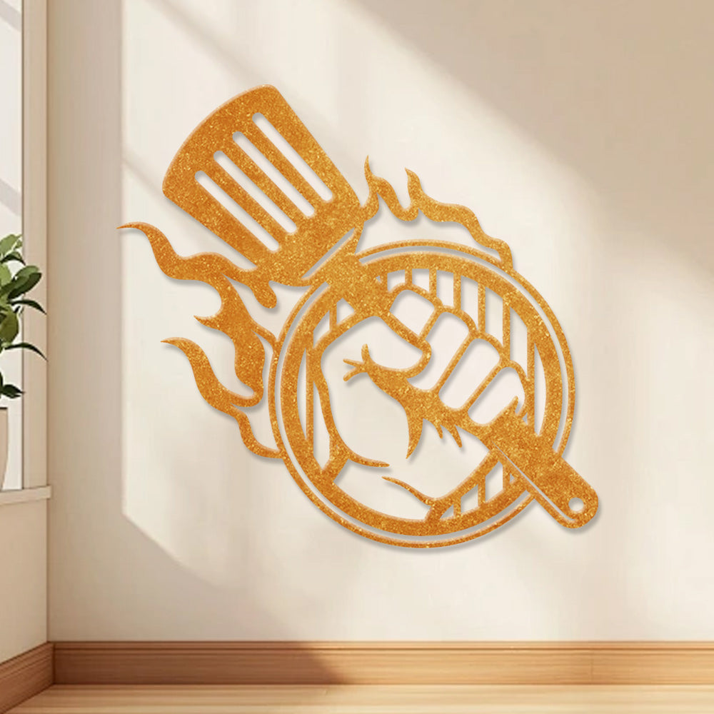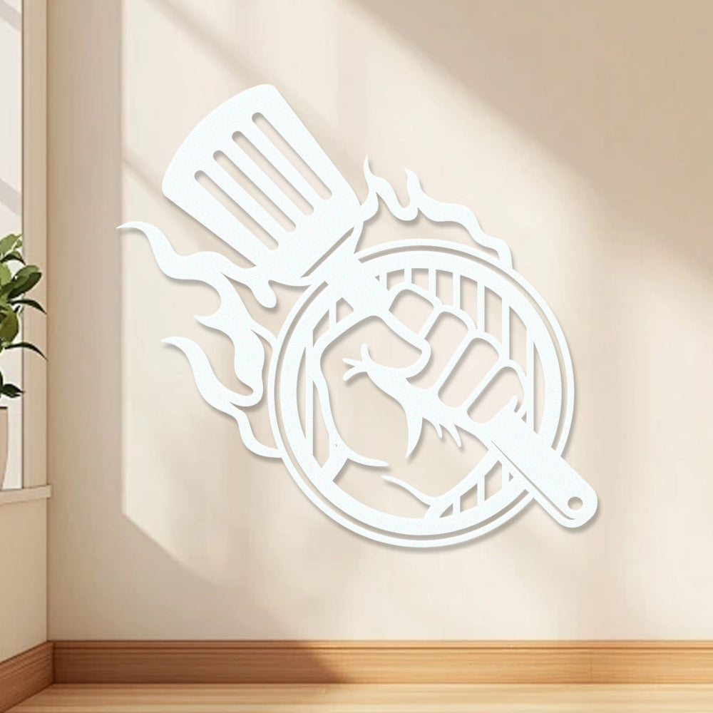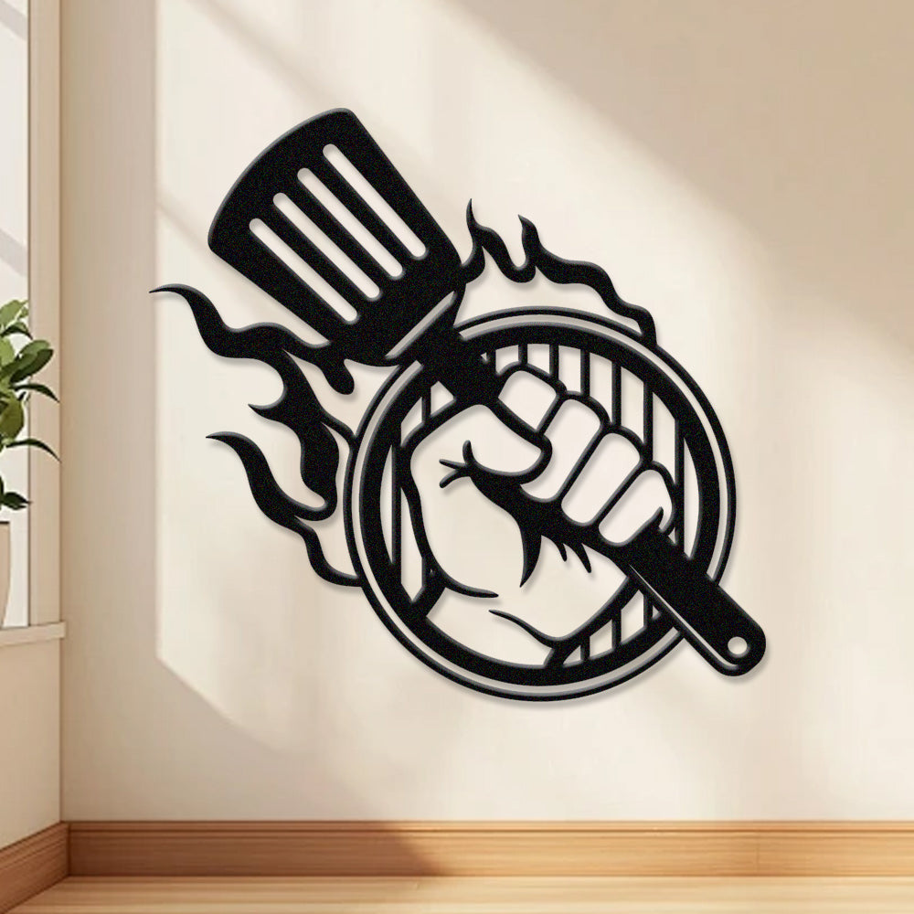 BBQ Metal Wall Art - Grilling Tools with Flame Iron Sign for Outdoor Kitchen