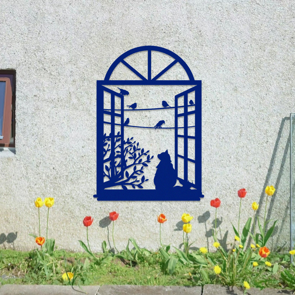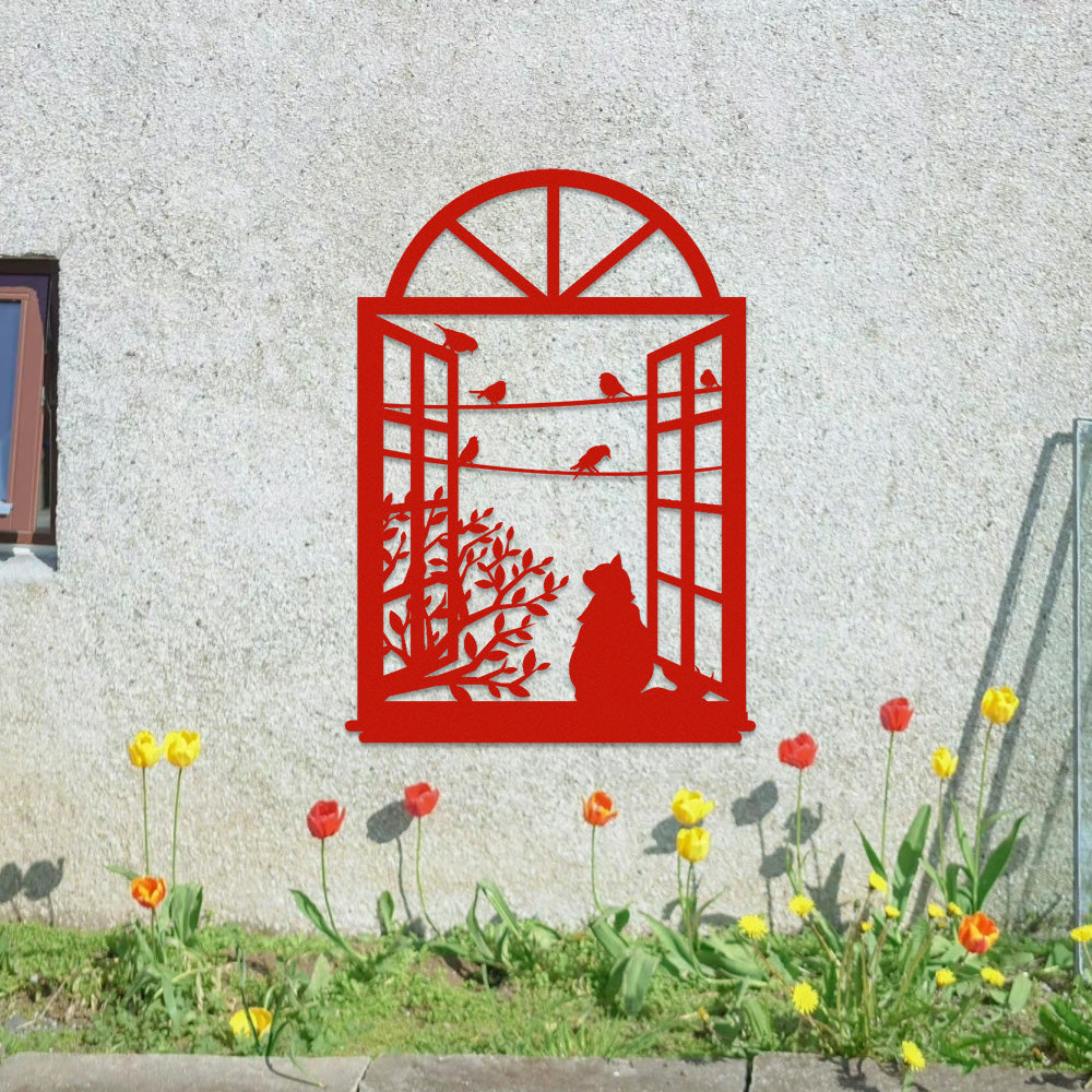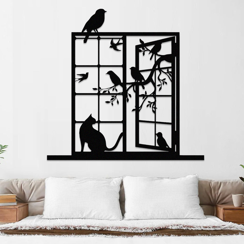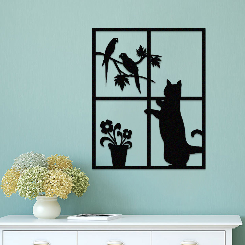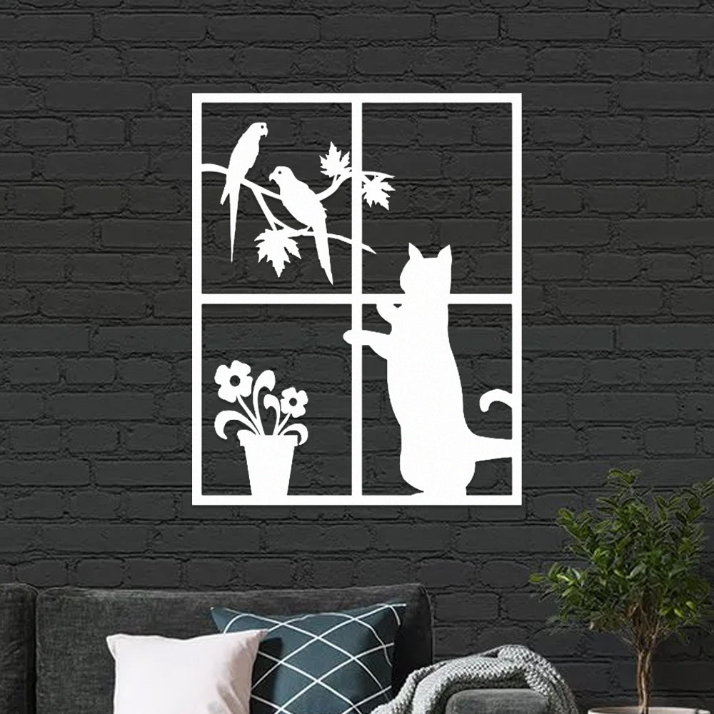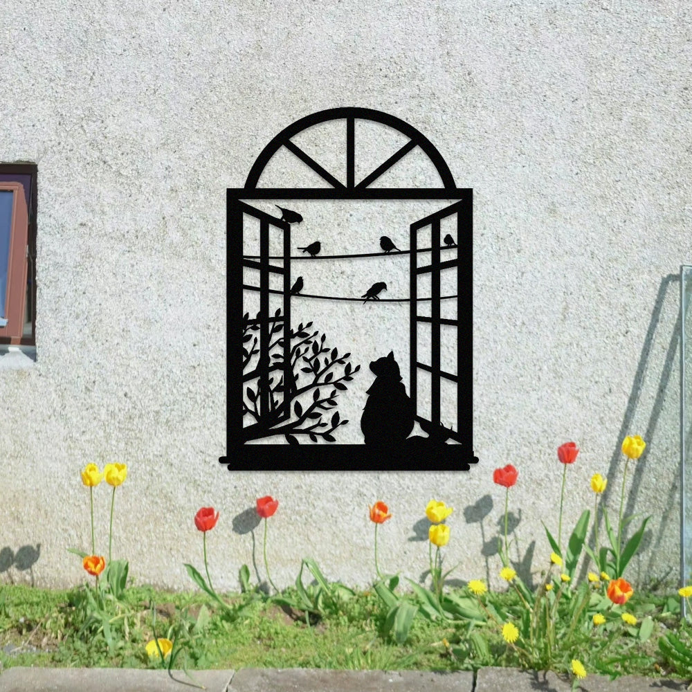 Cat and Bird Window Metal Wall Art