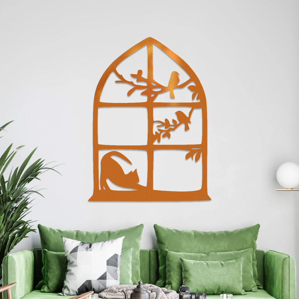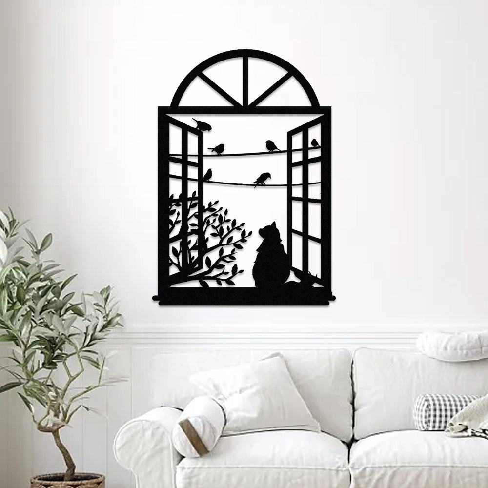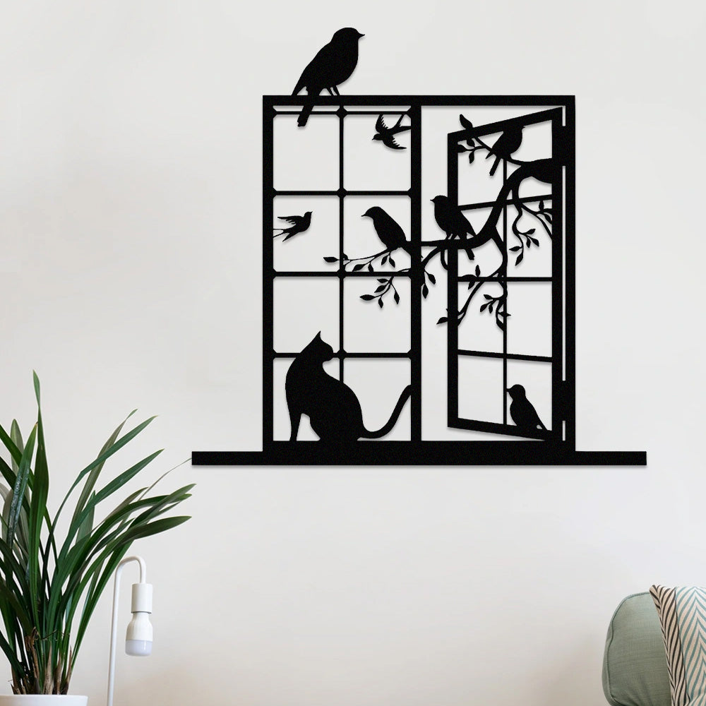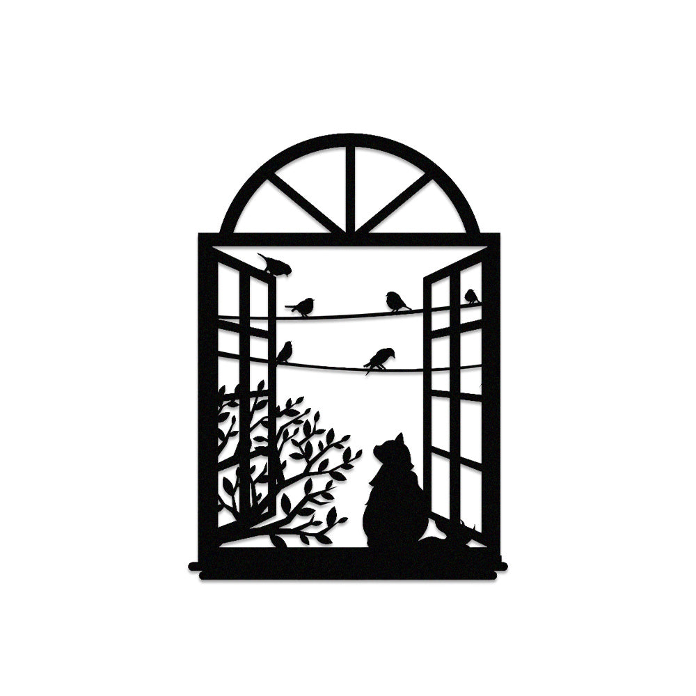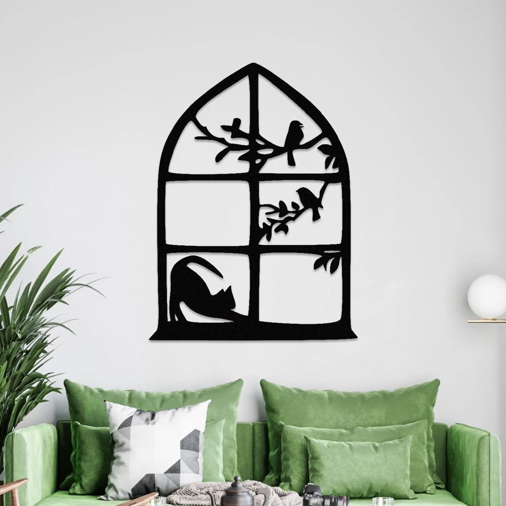 Cat and Bird Window Metal Wall Art