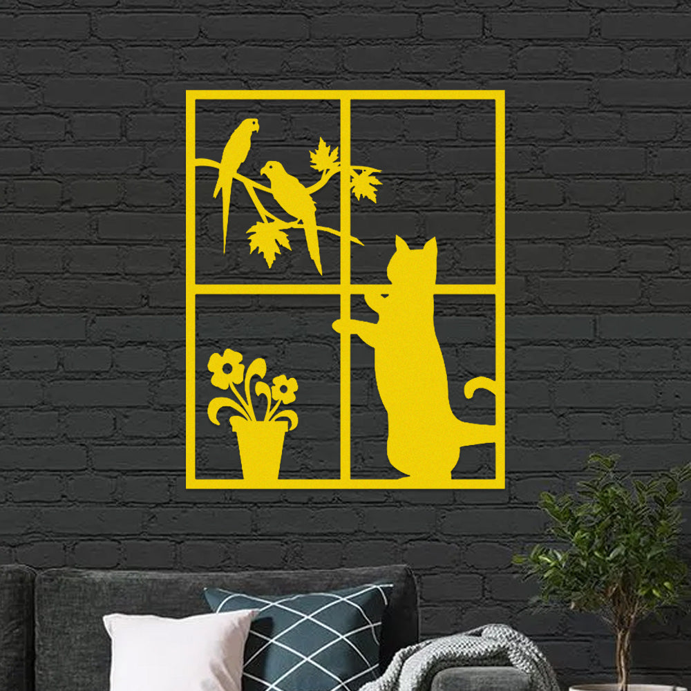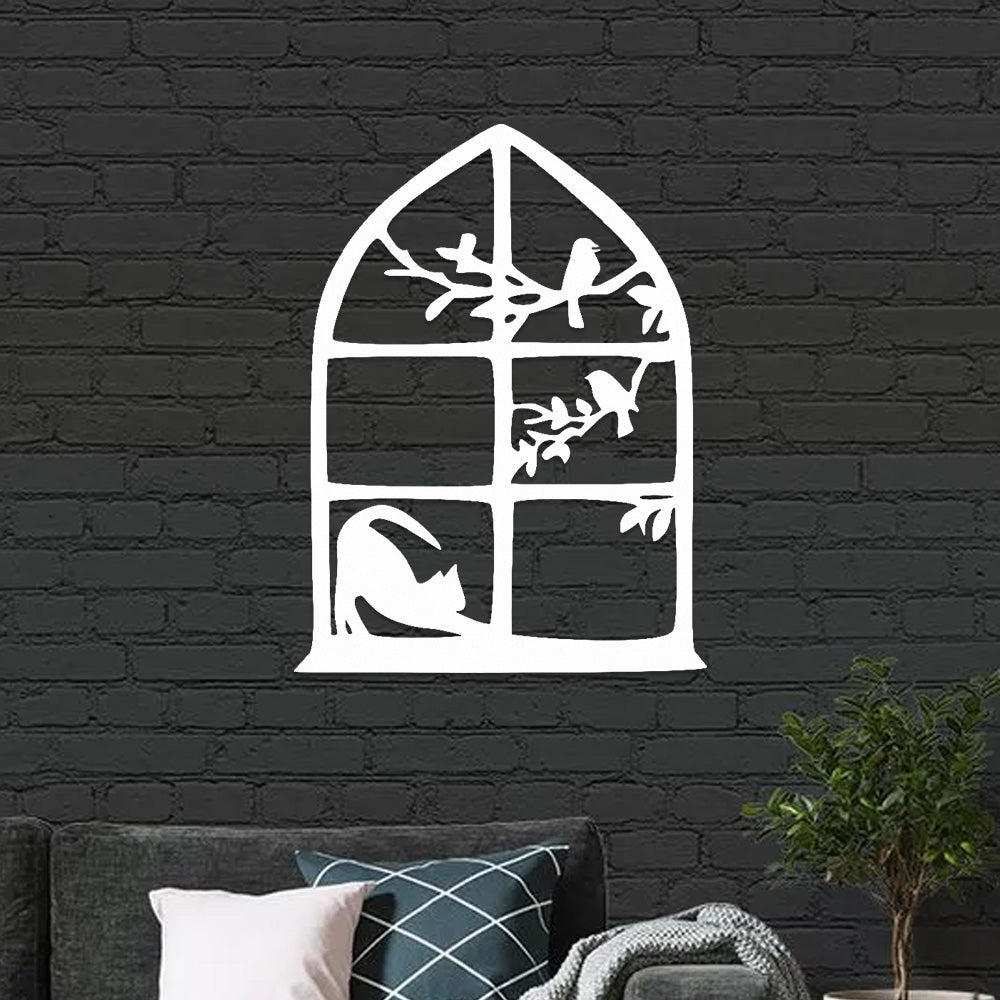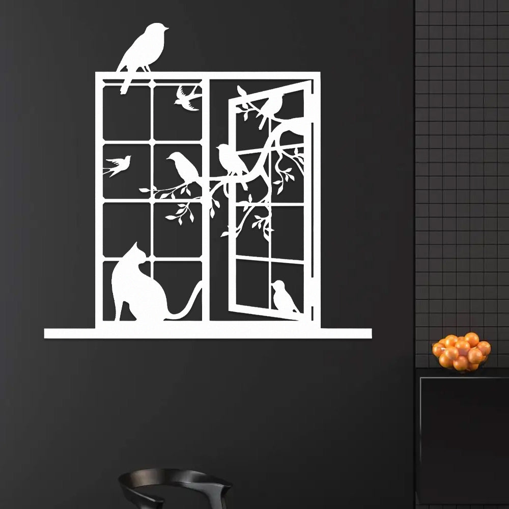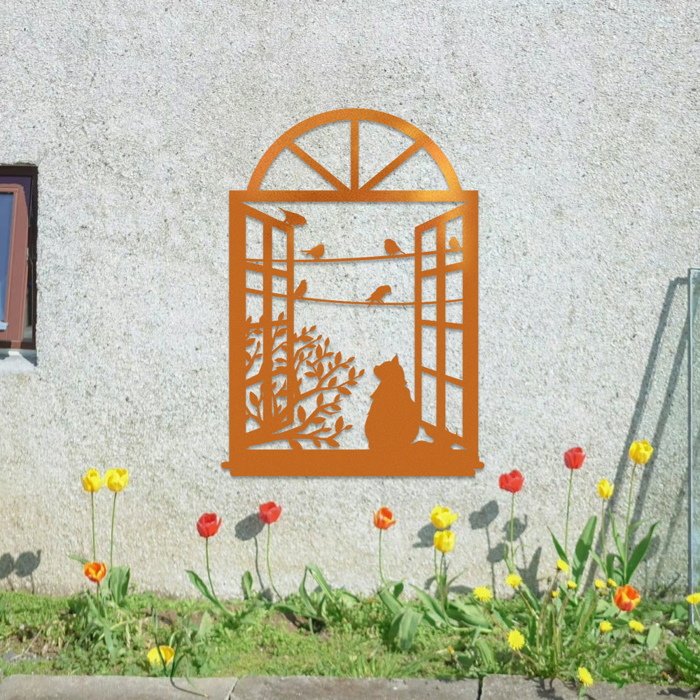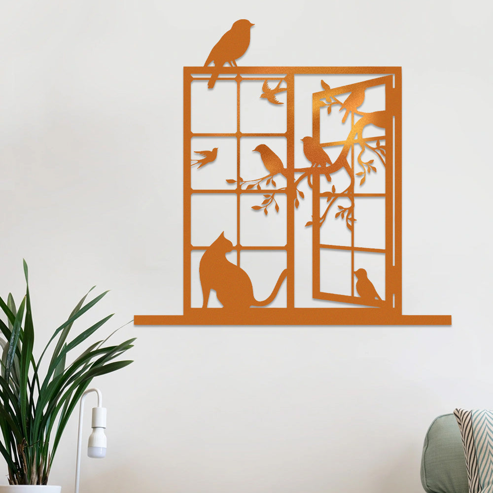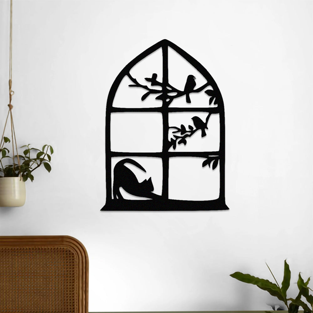 Cat and Bird Window Metal Wall Art