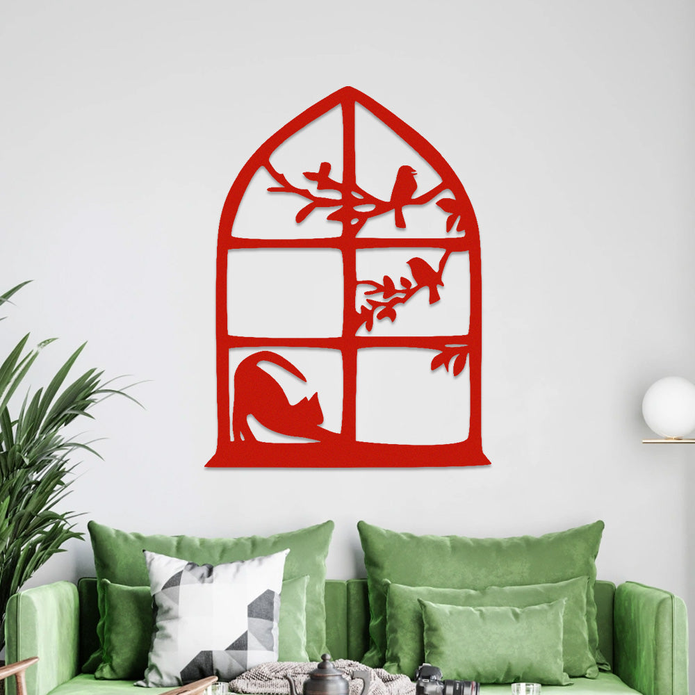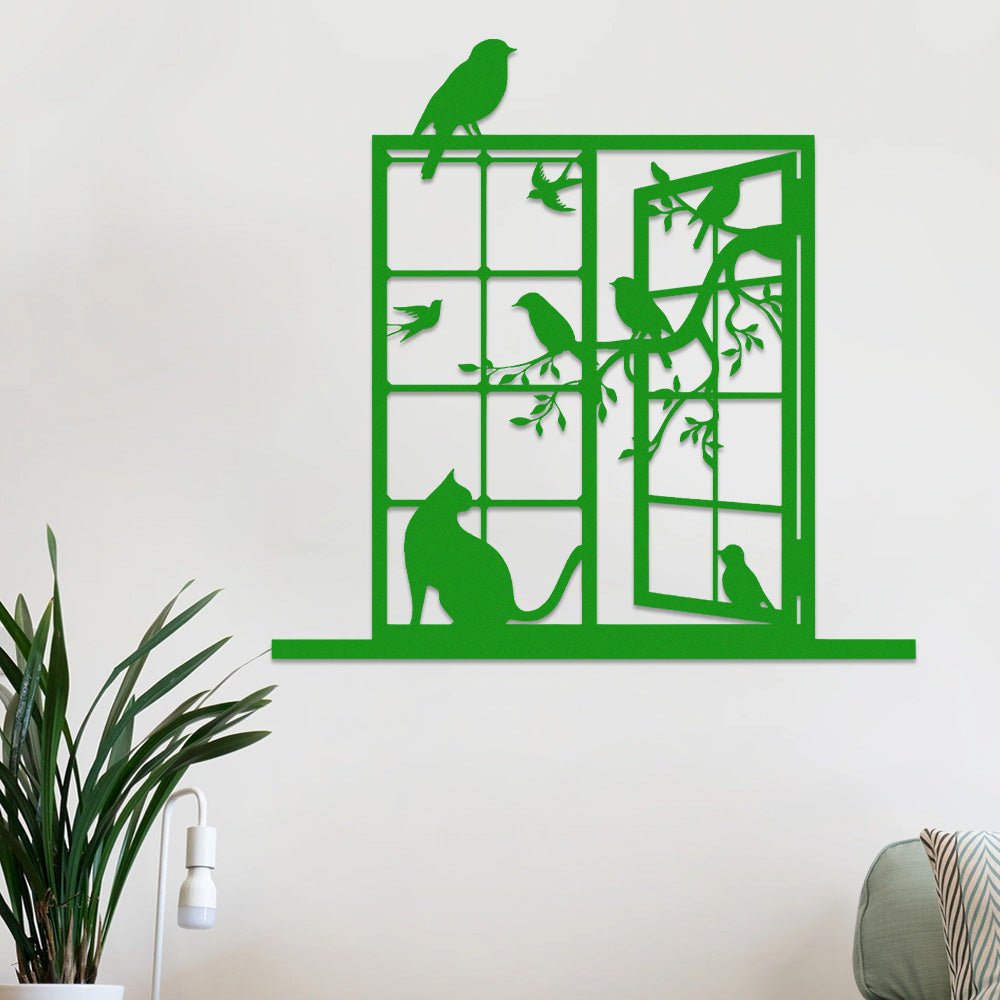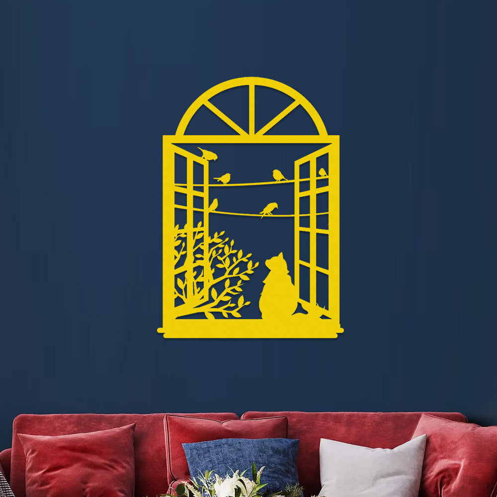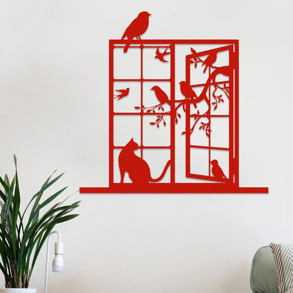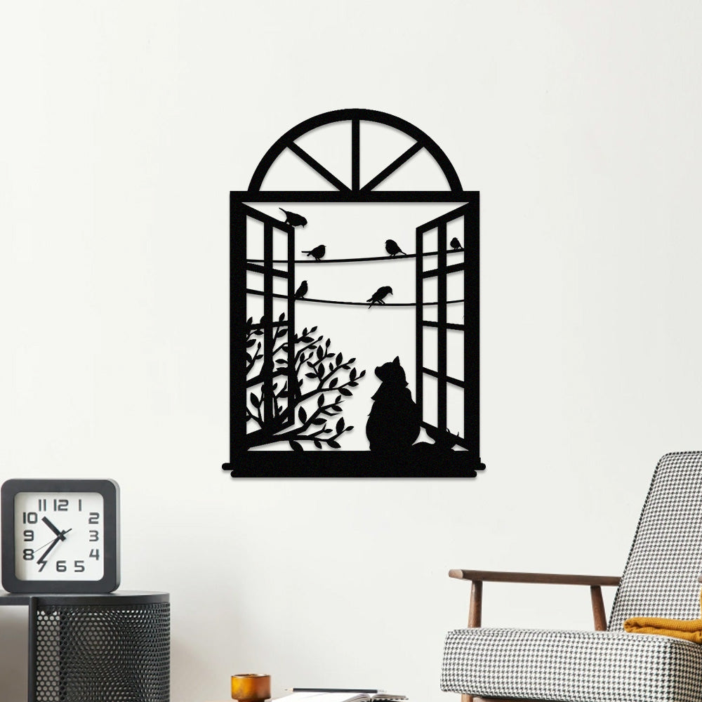Cat and Bird Window Metal Wall Art